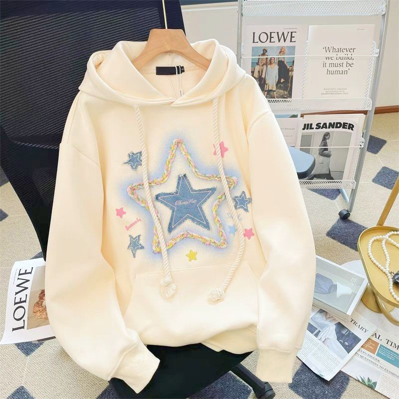Vintage Star Print Hoodies Women Streetwear Loose Long Sleeve Sweatshirts American Retro Bf Casual Harajuku Pullover Tops