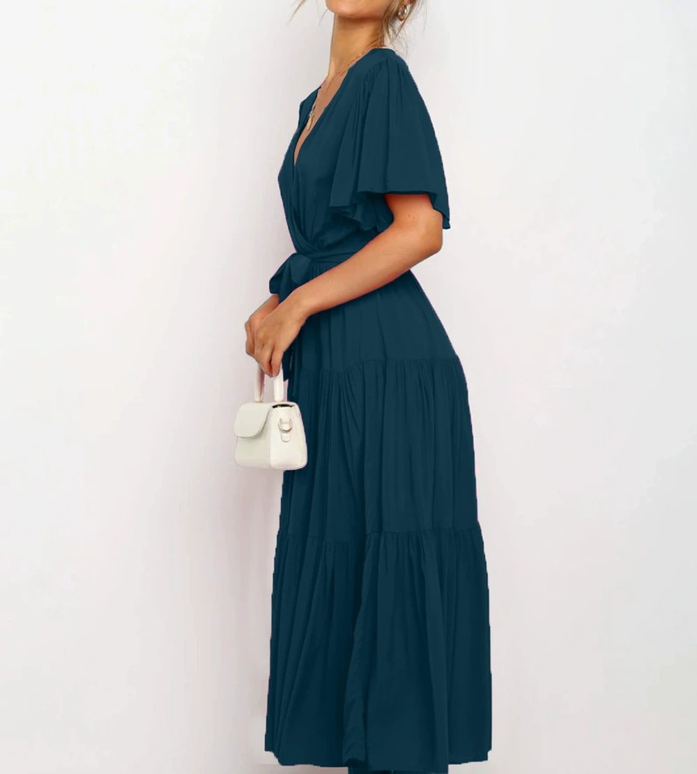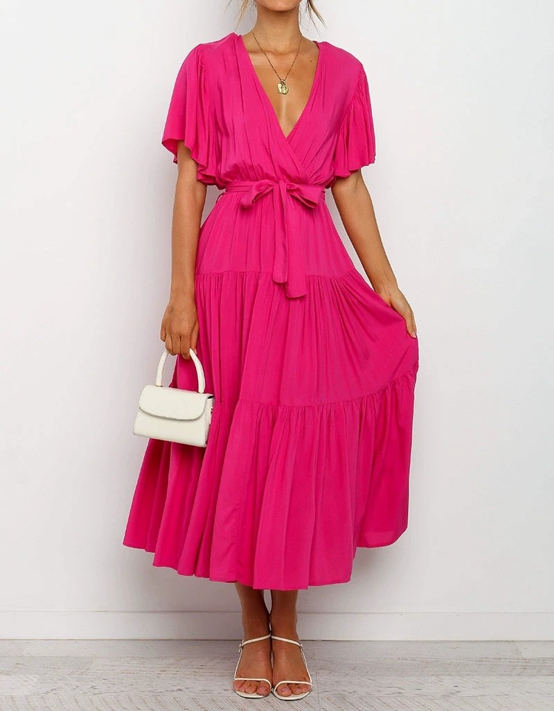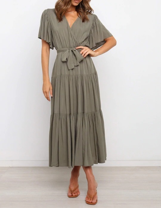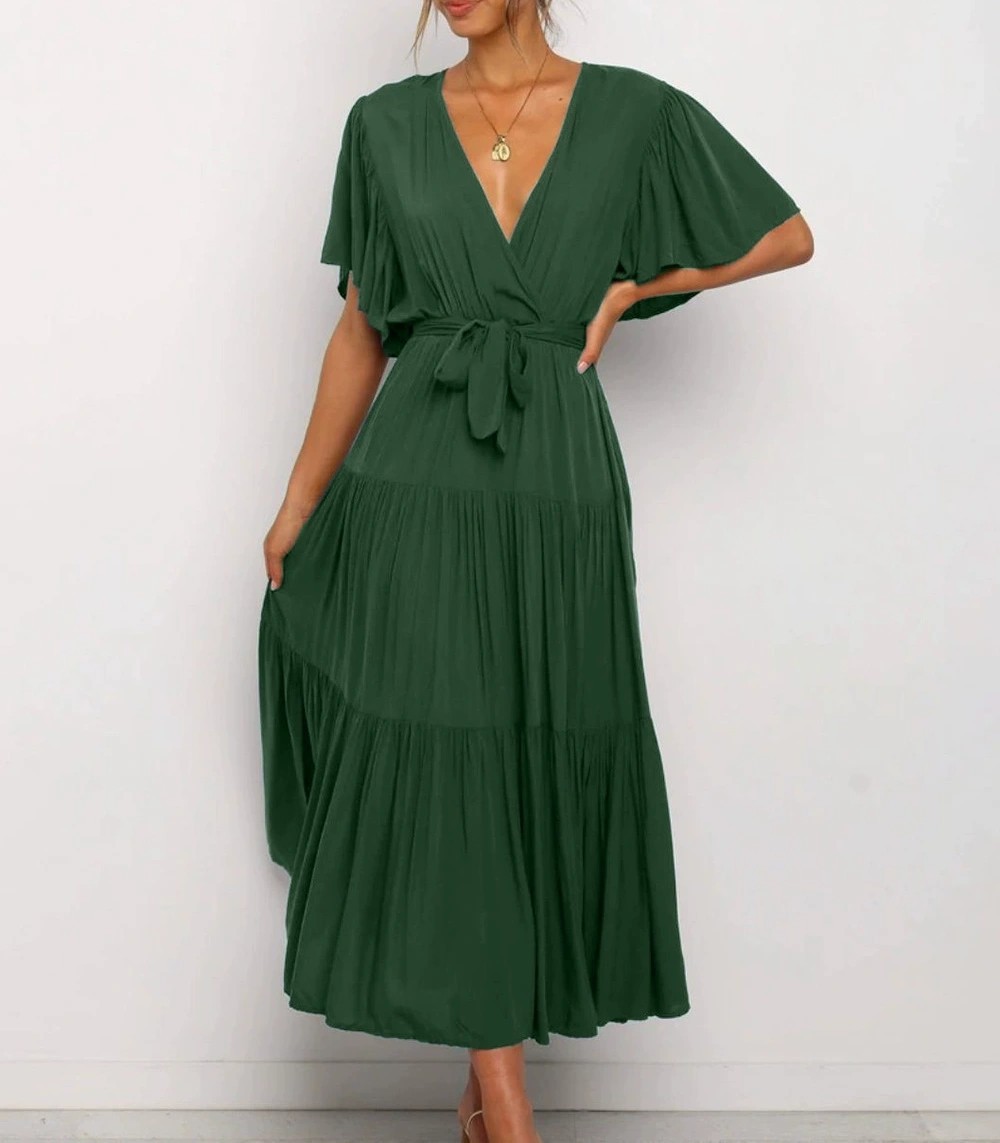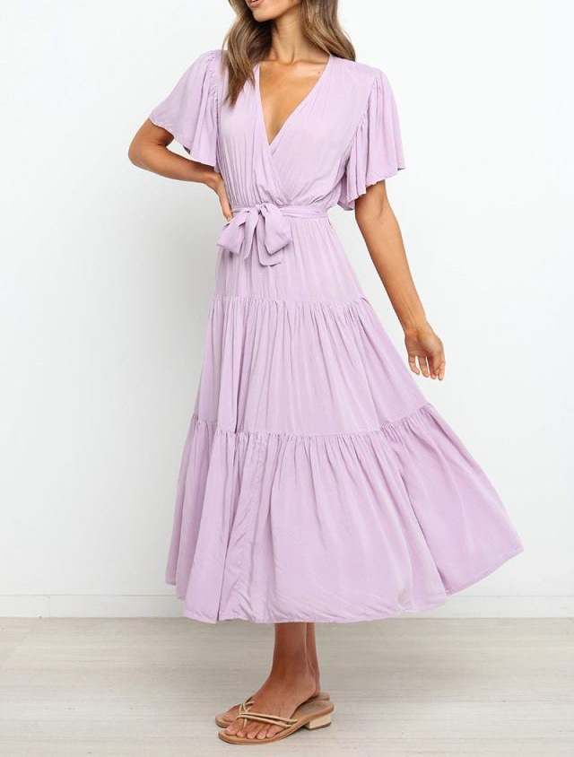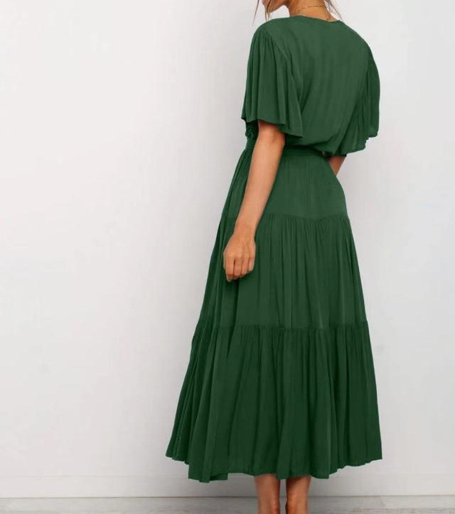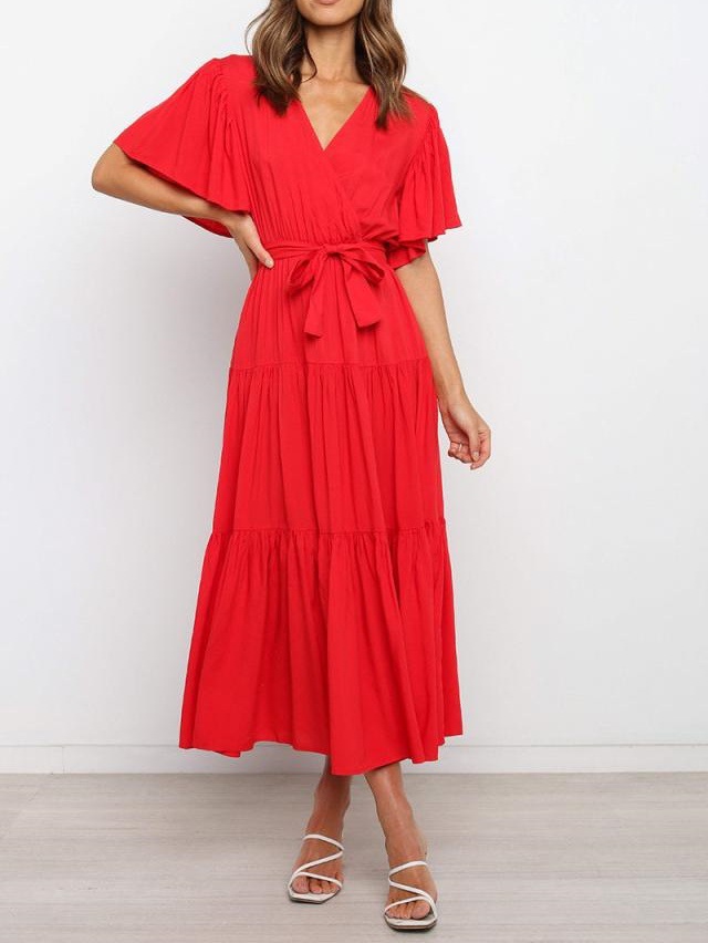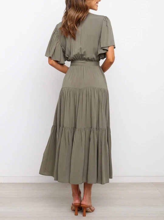 Women's Elegant Boho Lace-up V-neck Party Dresses Spring Summer New Female French Pleated Solid Short Sleeves Big Hem Midi Dress